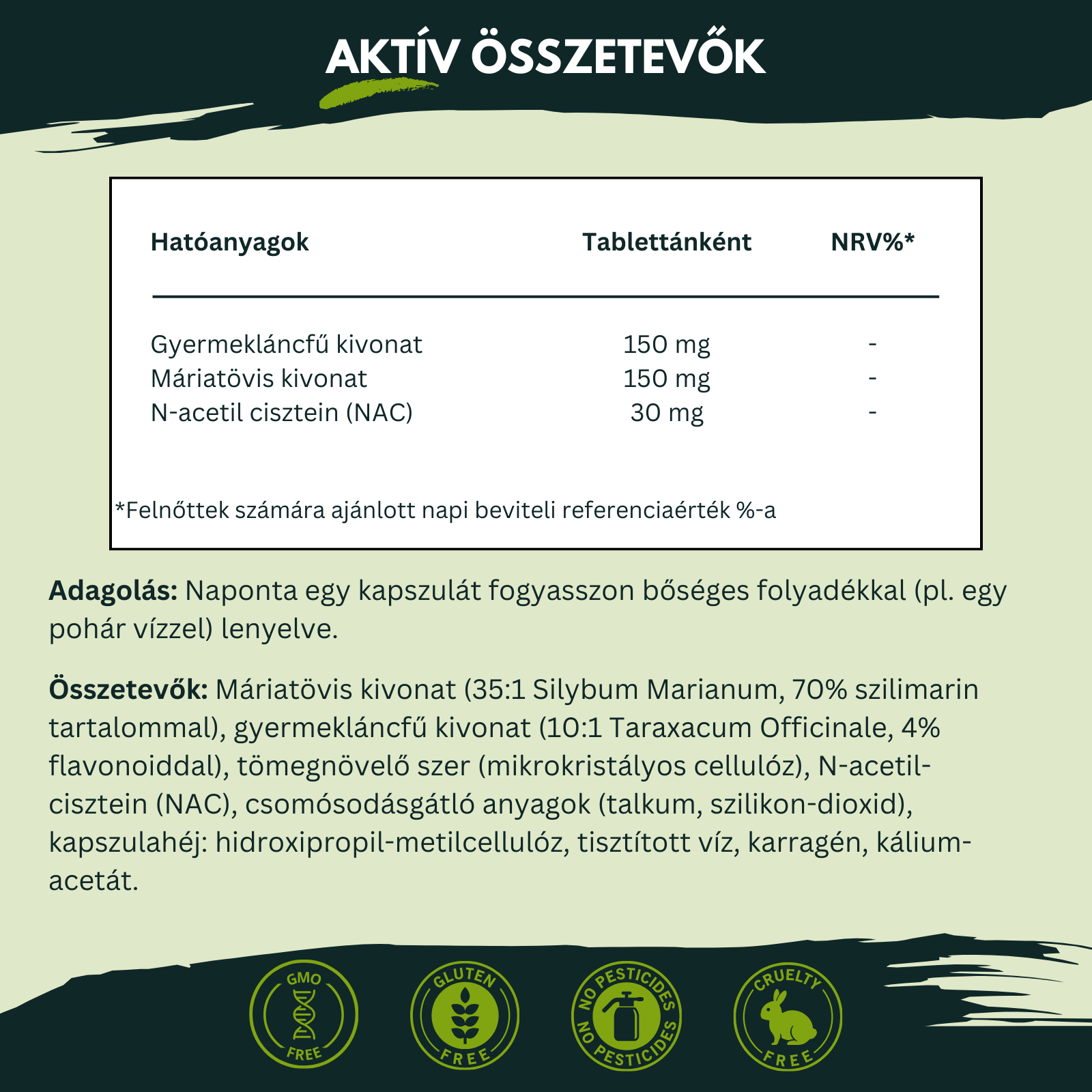 máriatövis kivonat (35:1 Silybum Marianum, 70% szilimarin tartalommal), gyermekláncfű kivonat (10:1 Taraxacum Officinale, 4% flavonoiddal), tömegnövelő szer (mikrokristályos cellulóz), N-acetil-cisztein (NAC), csomósodásgátló anyagok (talkum, szilikon-dioxid), kapszulahéj: hidroxipropil-metilcellulóz, tisztított víz, karragén, kálium-acetát.