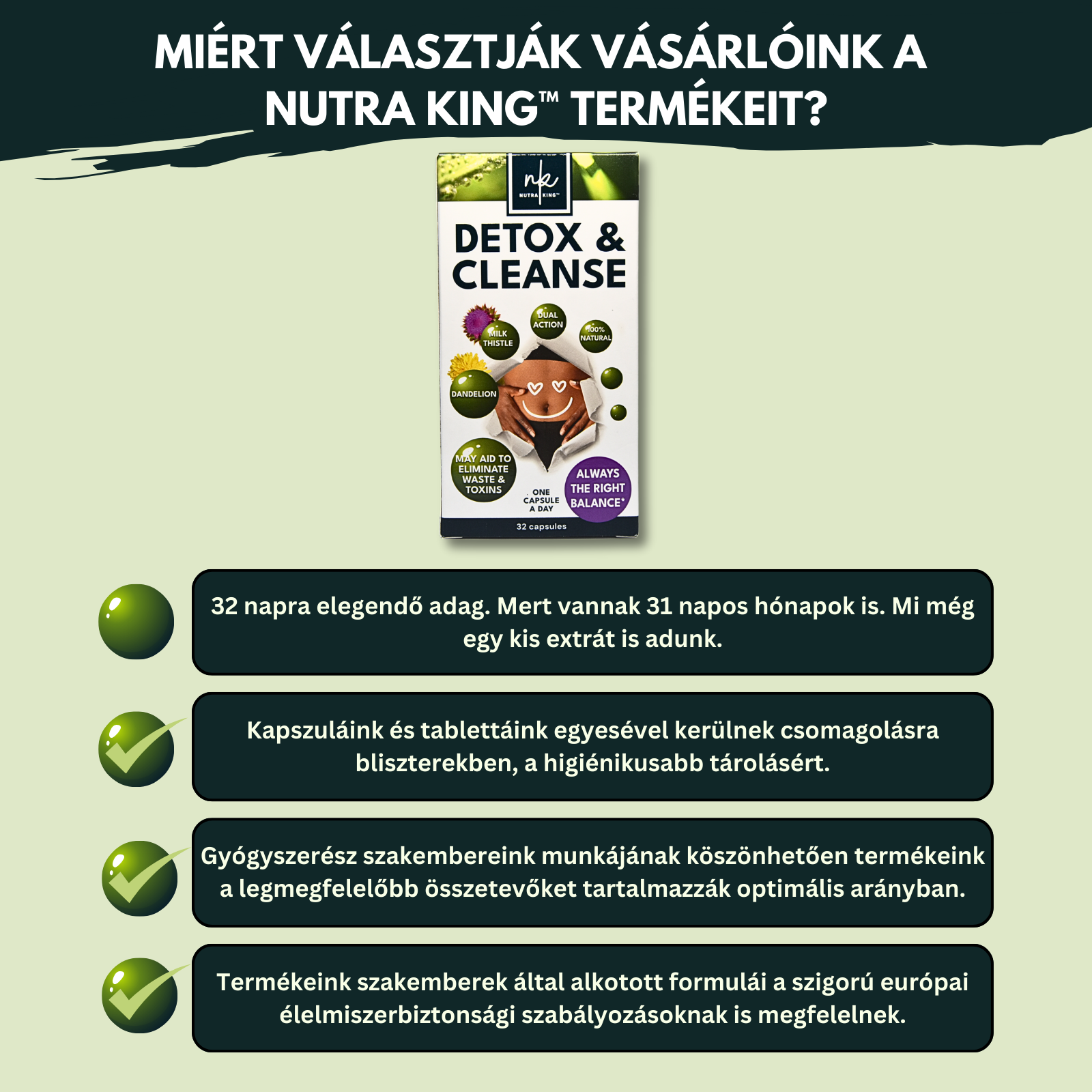 A NUTRA KING DETOX & CLEANSE étrend-kiegészítő kapszulája természetes máriatövis és gyermekláncfű kivonatot tartalmaz, N-Acetil-Ciszteinnel (NAC) kombinálva. Mindkét gyógynövény a májra gyakorolt kedvező hatásairól közismert, és úgy tartják, hogy segíthetnek az emésztőrendszer tisztán tartásában.
