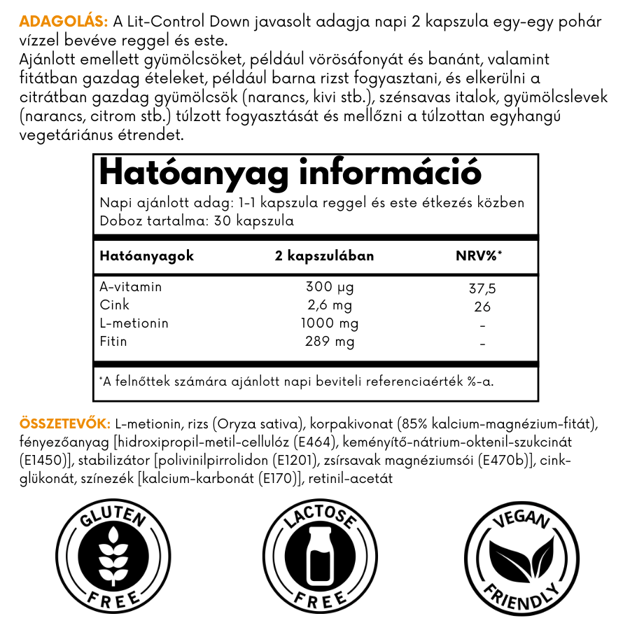 A Lit-Control Down 4 aktív összetevője: L-metionin, rizs-korpa kivonat, cink és A-vitamin.